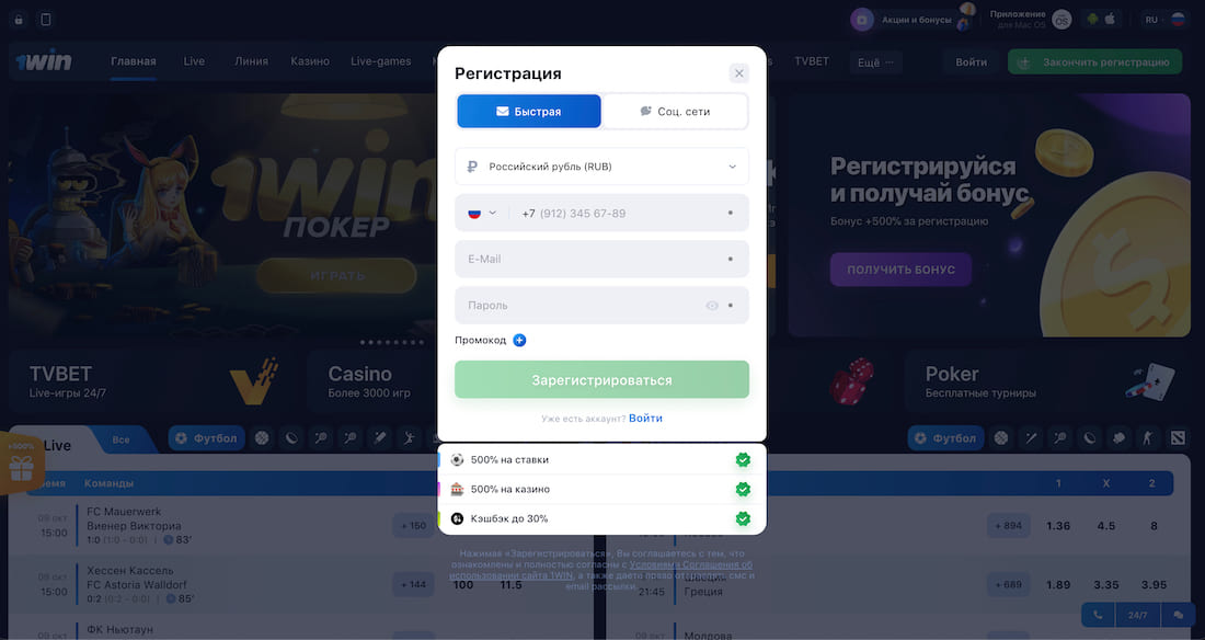 Чтобы начать делать ставки в 1 вин, необходимо создать учетную запись. Регистрация доступна исключительно пользователям, достигшим совершеннолетия, так как букмекерская компания строго соблюдает требования действующего законодательства.